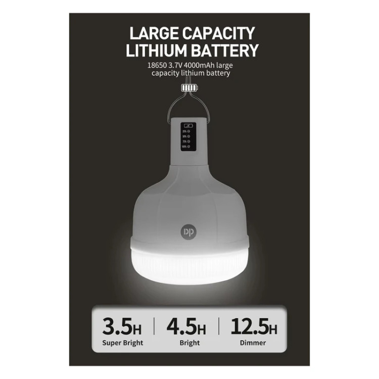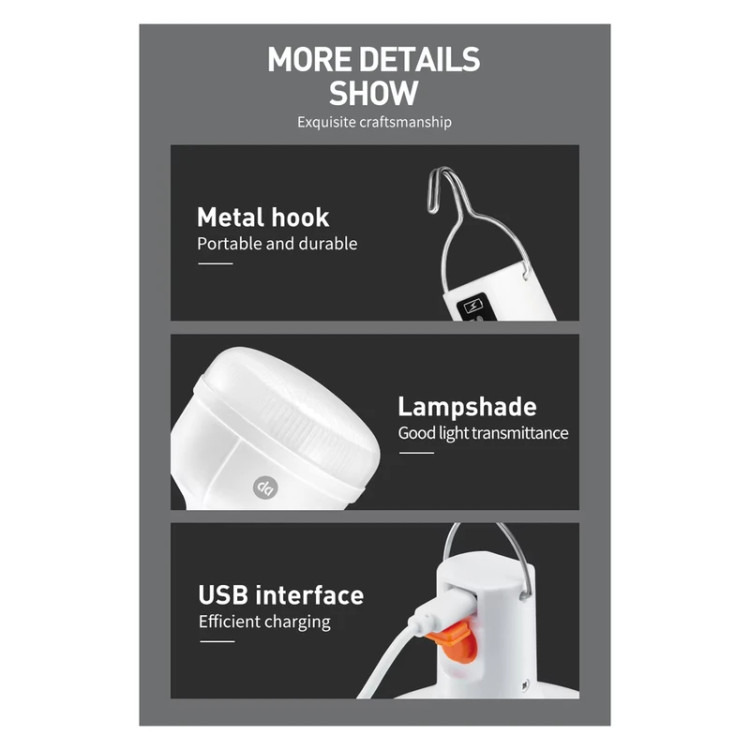 مجهز به نشانگر LED جهت اطلاع از وضعیت شارژ، دارای کلید فیزیکی جهت خاموش/ روشن کردن و تغییر حالت نوردهی نوع لامپ LED با نوردهی مهتابی و توان مصرفی ۱۸ وات، دارای ۳ حالت نوردهی شامل قوی، متوسط، ضعیف تامین انرژی از طریق باتری داخلی قابل شارژ از نوع لیتیومی از نوع ۱۸۶۵۰ با ظرفیت ۲۰۰۰ میلی آمپر ساعت مناسب برای کمپینگ، مسافرت، طبیعت گردی و ...، موفق به کسب گواهی استاندارد محصولات شامل CE مدت زمان شارژدهی در حالت نور قوی در حدود ۳.۵ ساعت، متوسط ۴.۵ ساعت و ضعیف ۹ ساعت شارژ مجدد از طریق پورت میکرو یو اس بی در مدت زمان حدودی ۳.۵ ساعت توسط کابل همراه ساخته شده از متریال پلاستیک باکیفیت، مقاوم در برابر ضربه، فشار و حرارت، برخورداری از آویز مجهز به درپوش پورت به منظور جلوگیری از نفوذ گرد و غبار و رطوبت به داخل پورت